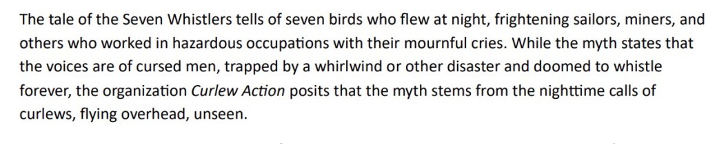 The tale of the Seven Whistlers tells of seven birds who flew at night, frightening sailors, miners, and others who worked in hazardous occupations with their mournful cries. While the myth states that the voices are of cursed men, trapped by a whirlwind or other disaster and doomed to whistle forever, the organization Curlew Action posits that the myth stems from the nighttime calls of curlews, flying overhead, unseen.