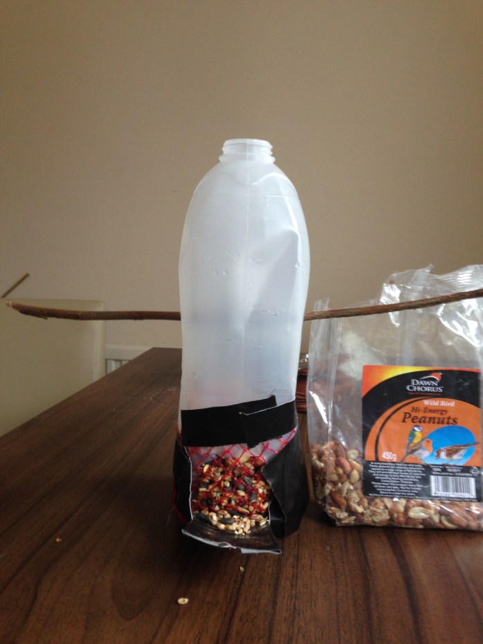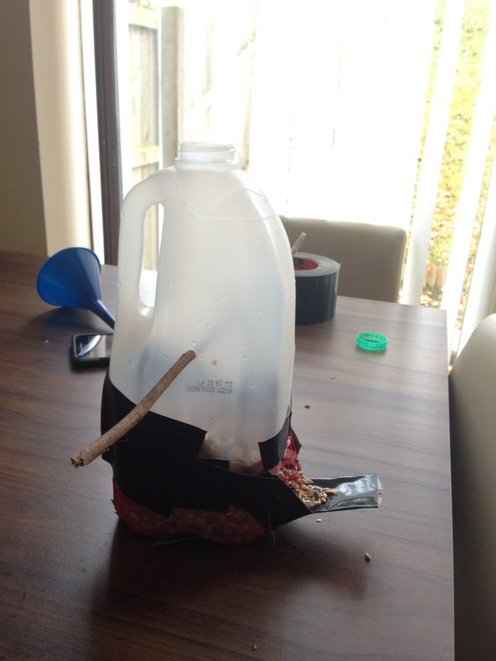 We took a 4 pint plastic milk jug, cut a little ‘door’ near the base, covered it in the net from some onions so the food wouldn’t fall straight through, and used Gorilla tape to cover sharp edges and stiffen the plastic.