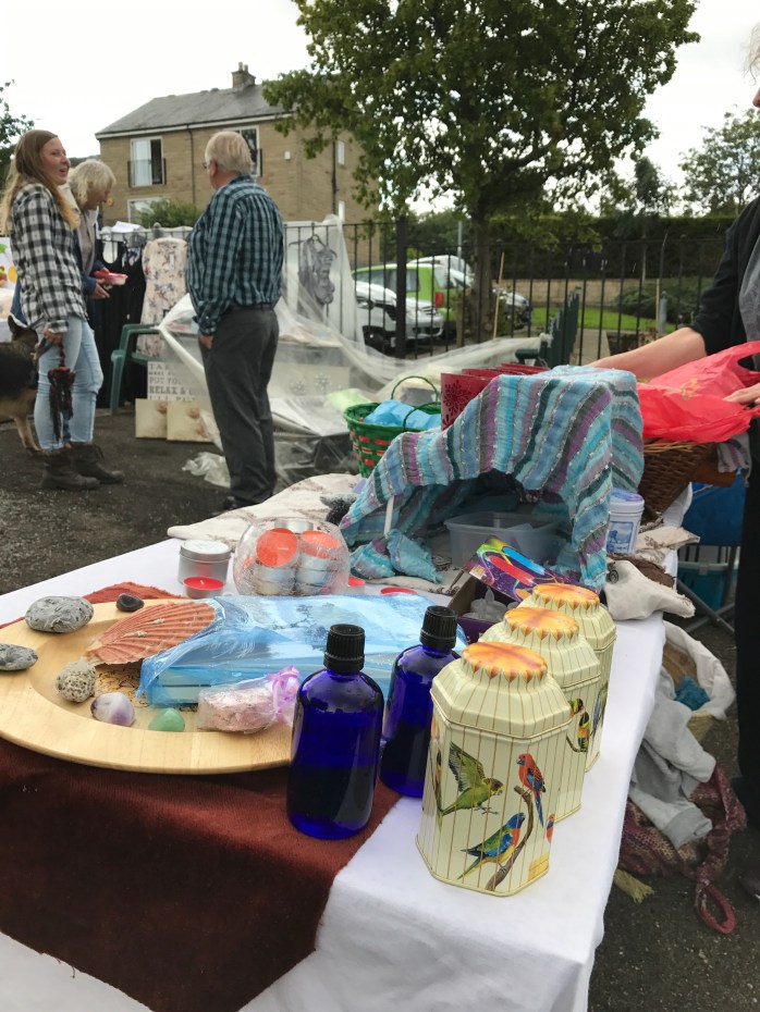 Beard oil, crystals and candles! The books are in freezer bags as it keeps raining, come on sun…