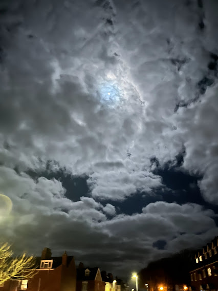 Image copyright Mabh Savage 2023. Image ID: Clouds surrounding the moon, lit up from behind, over a street of residential houses.