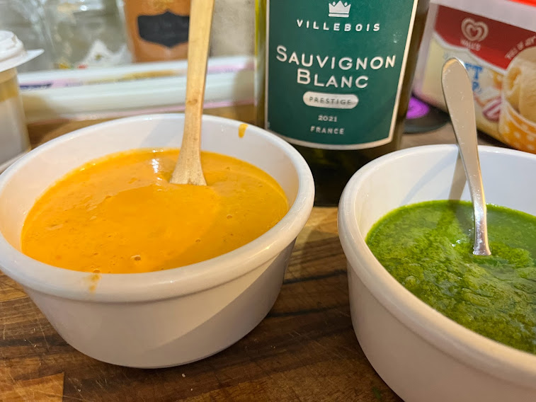 Image copyright Mabh Savage 2022. Image ID: Two white ramekins on a wooden chopping board, the left one has peach coloured sauce in and the right one has green sauce and a metal spoon in.