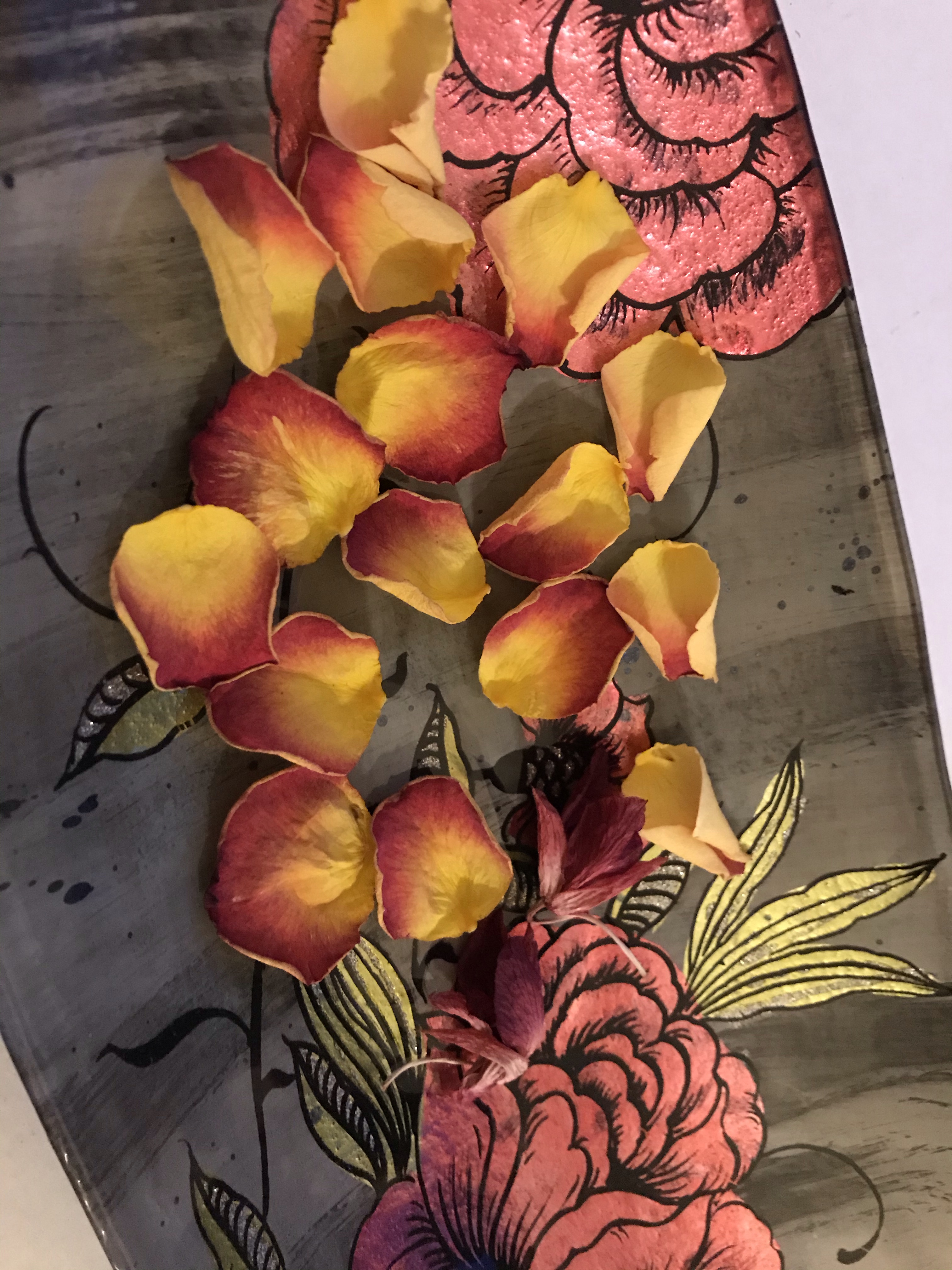 Drying out rose petals from an almost dead bouquet in a single layer. Once dried, they’ll be kept in an airtight jar or displayed in a pretty bowl- like this one! Can anyone identify the other two flowers already drying out in there?